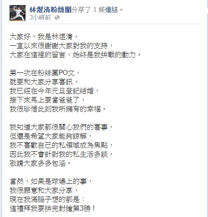 今天台灣體壇爆出震撼彈,跆拳道漂亮寶貝楊淑君傳出已於今年一月嫁給中信兄弟象投手林煜清,而且已經懷孕五個多月,林煜清稍早也於自己的Facebook證實這項消息。