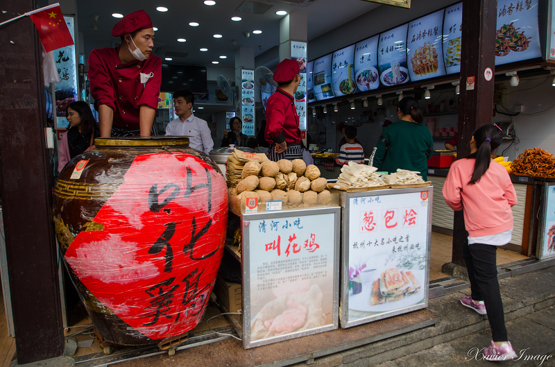 叫化雞顧名思義跟叫化子有關,相傳以前曾有個叫化子餓昏了,旁邊的叫化子趕緊偷來一隻雞給他吃,因為沒鍋子,只好包上泥土放進火推燒烤,沒想到意外造就了這道美食,在杭州隨處可見。