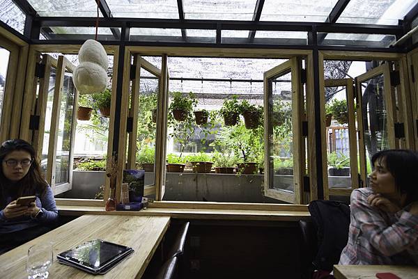 靠窗座位區外面放滿小盆栽 他們的菜單很特別 是用平板看的