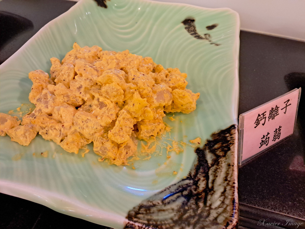 看起來很特別、甚至怪怪的鈣離子蒟蒻 味道卻不差 外面是黃芥末的味道